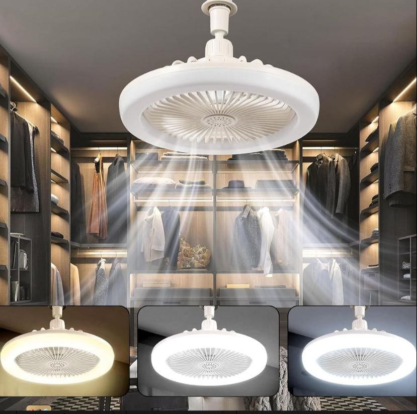 Dispositivo 2 en 1 que combina una lámpara LED de bajo consumo con un ventilador integrado. Proporciona una iluminación uniforme y fresca circulación de aire en un solo equipo. Ideal para techos bajos o espacios reducidos, se instala fácilmente como un bombillo convencional. Su motor silencioso y su diseño compacto lo hacen práctico, funcional y eficiente en el uso de energía.