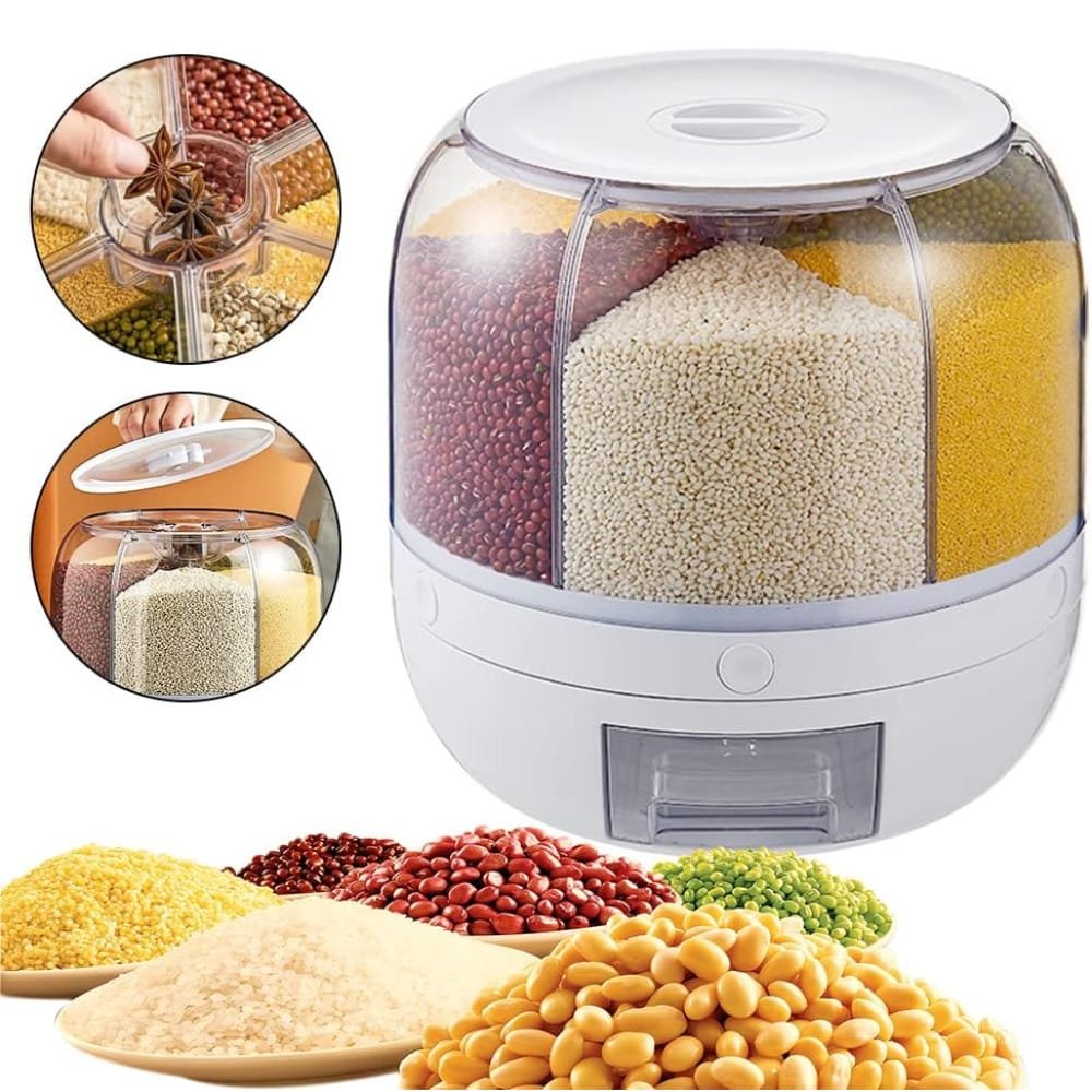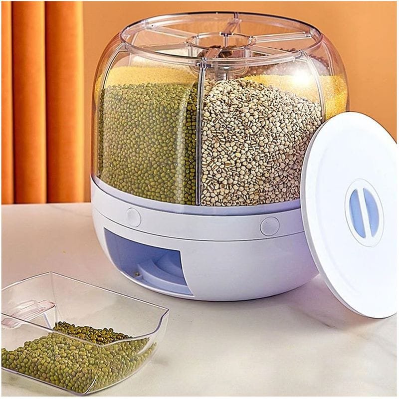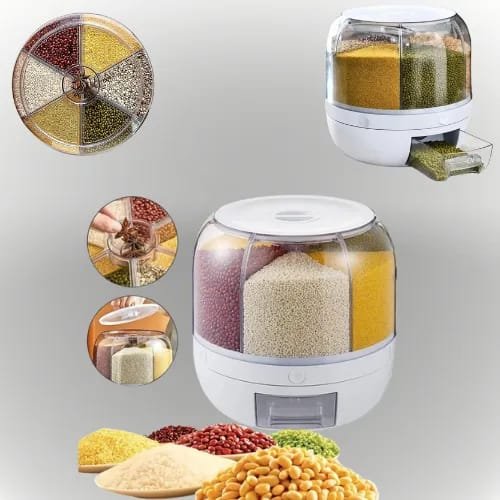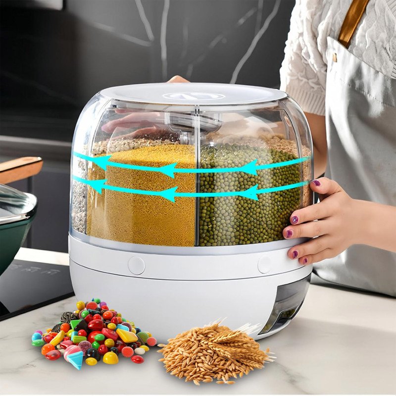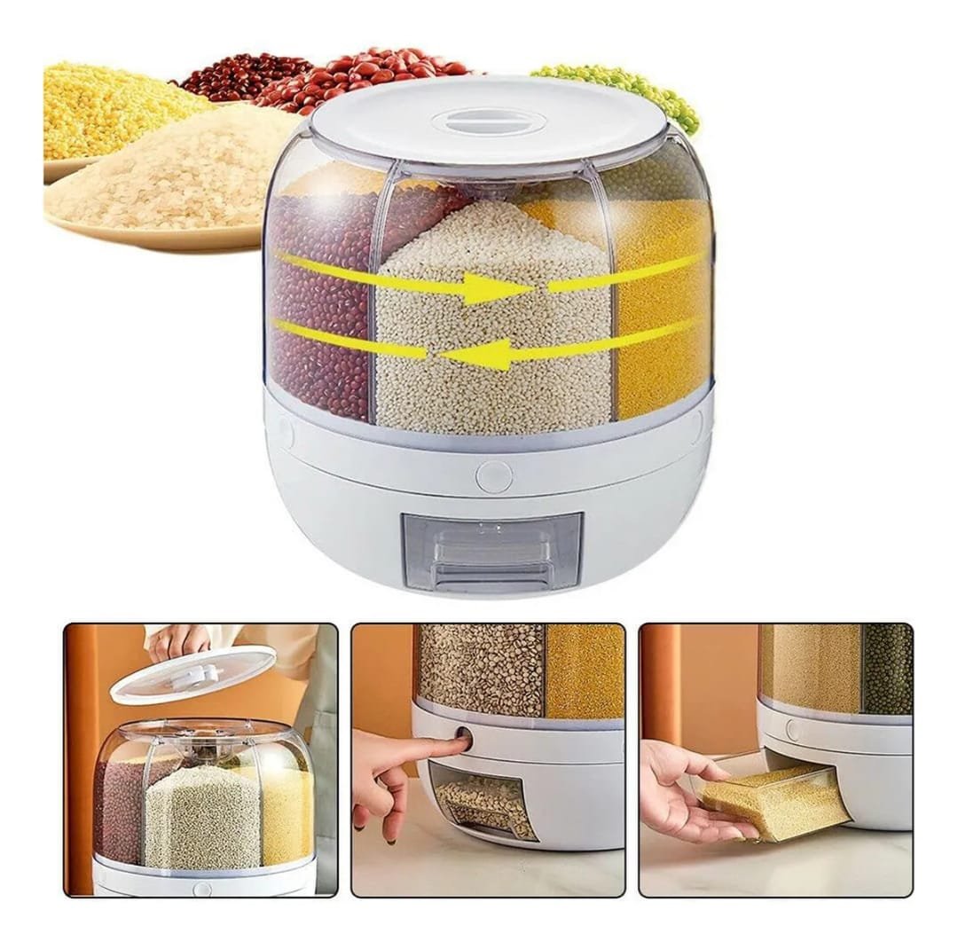 Recipiente de almacenamiento y distribución de alimentos secos como arroz, lentejas, cereales o granos en general. Su diseño cilíndrico o giratorio permite un acceso desde cualquier ángulo, facilitando la selección y dosificación del contenido con solo girar la parte superior o la base.