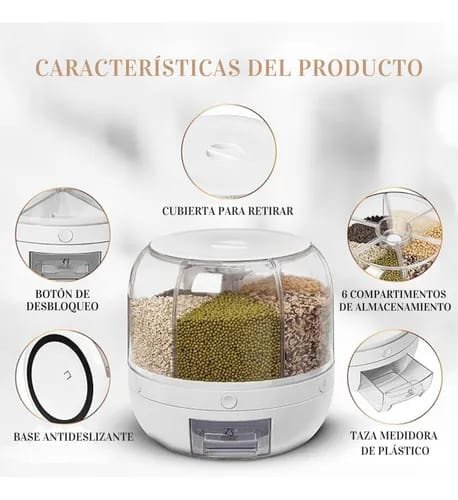 Cuenta con compartimentos divididos para almacenar diferentes tipos de granos en un solo dispositivo, y cada uno suele tener un botón o palanca que libera una porción controlada del alimento. Fabricado en plástico transparente o translúcido, permite ver fácilmente el contenido y el nivel de llenado. Es ideal para mantener la despensa organizada, higiénica y libre de humedad, optimizando el espacio y reduciendo el desperdicio.
